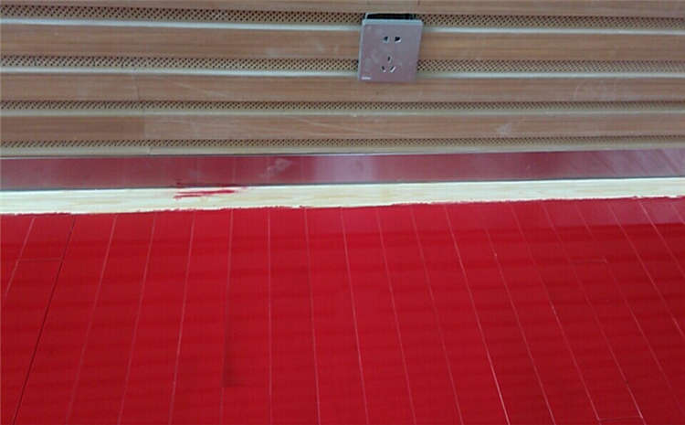 5、鋪裝實木運動地板:為到達流暢的線條掩蔽藝術結果,并兼顧板材的把持率,須以1軌范中依照房室內籃球館木地板案例型差異所定基準線為基準,入部動手遏制鋪裝。地板用50mm地板羅紋釘安穩。地板鋪裝靠墻處必須留有8mm12mm的伸縮縫,以利地板的伸縮,戒備地板因受潮而起拱。末端安裝踢腳線。